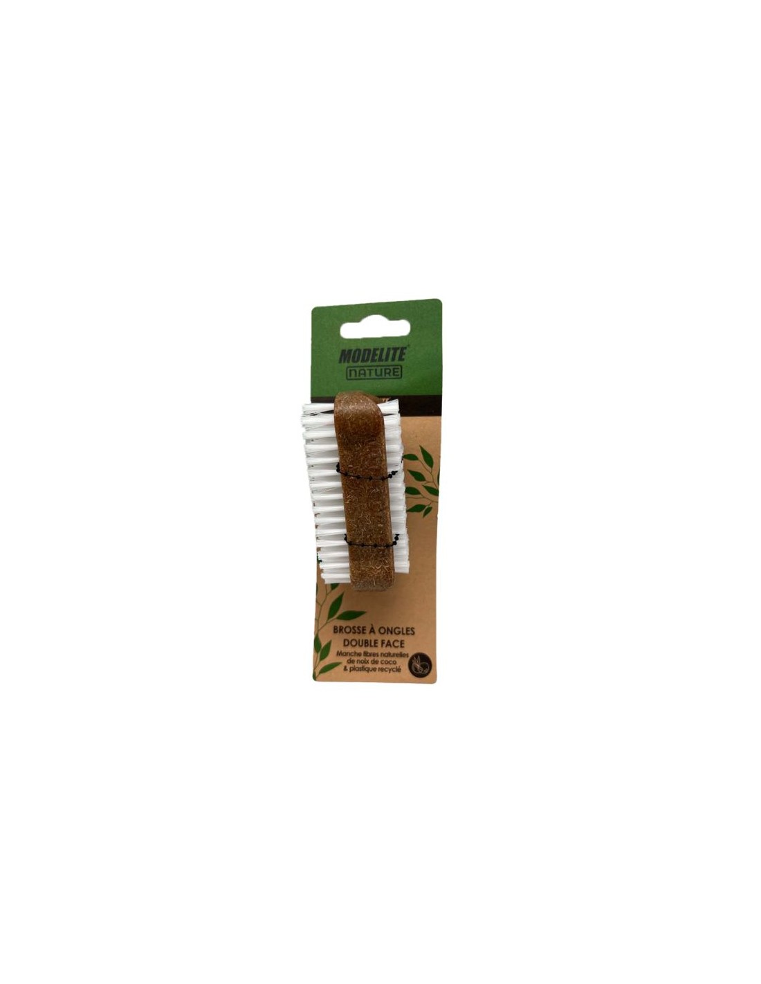 Cepillo de uñas Modelite Nature de doble cara, fabricado con mango de fibra de coco y plástico reciclado. Cuenta con cerdas de nylon blanco de distinta longitud para una limpieza eficaz de uñas y manos. Compacto, resistente y sostenible, ideal para el cuidado diario.